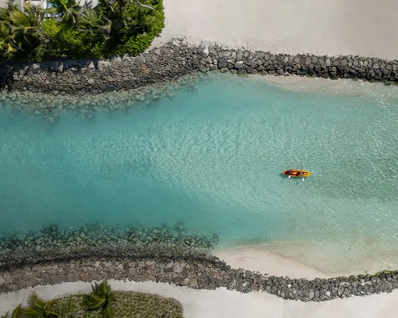 Suspended above the turquoise waters of our lagoon, with spectacular views of the lagoon and glimpses of the city, you are just a short swim from the reef, perfect for snorkeling. Take a refreshing dip in the ocean, then relax in your elegant water-villa with a private pool.